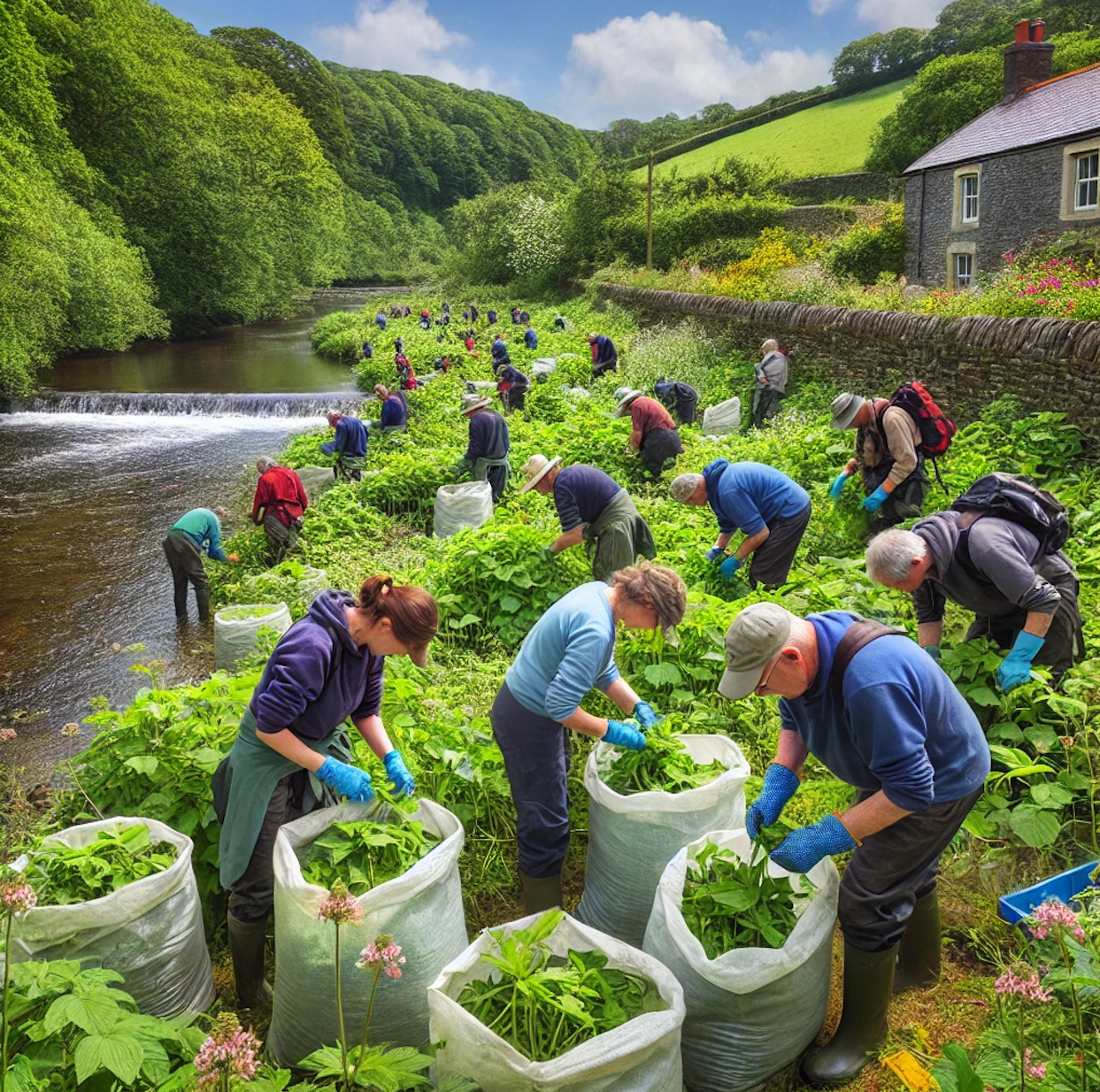 Himalayan balsam (Impatiens glandulifera) is an invasive, non-native plant species that spreads rapidly along riverbanks and ditches. It outcompetes native flora, leading to reduced biodiversity. In winter, its shallow roots die back, leaving riverbanks bare and vulnerable to erosion. Removing it helps restore natural habitats and protect local ecosystems. Removing it greatly improves the surrounding habitat and biodiversity.